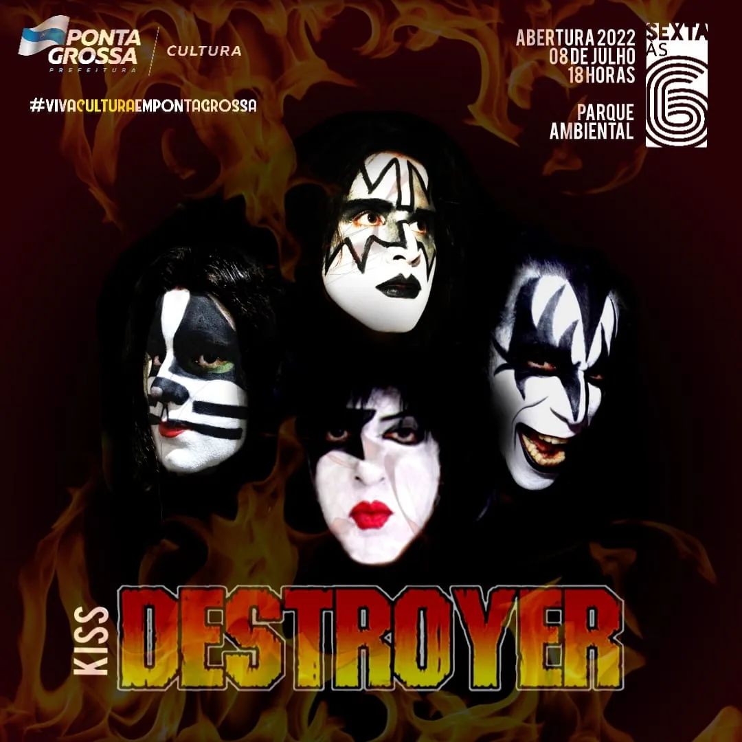 A banda que fará o lançamento da temporada 2022 do Sexta às Seis nasceu em 1984 e já realizou mais de 15 mil shows. Formada por entusiastas do grupo Kiss, a Destroyer Kiss toca ao vivo os antigos sucessos do Kiss, sem se esquecer da performance de palco e todo o aparato cênico característico dos shows de hard rock dos Estados Unidos. Os quatro integrantes vestem as fantasias e utilizam a mundialmente famosa maquiagem teatral.