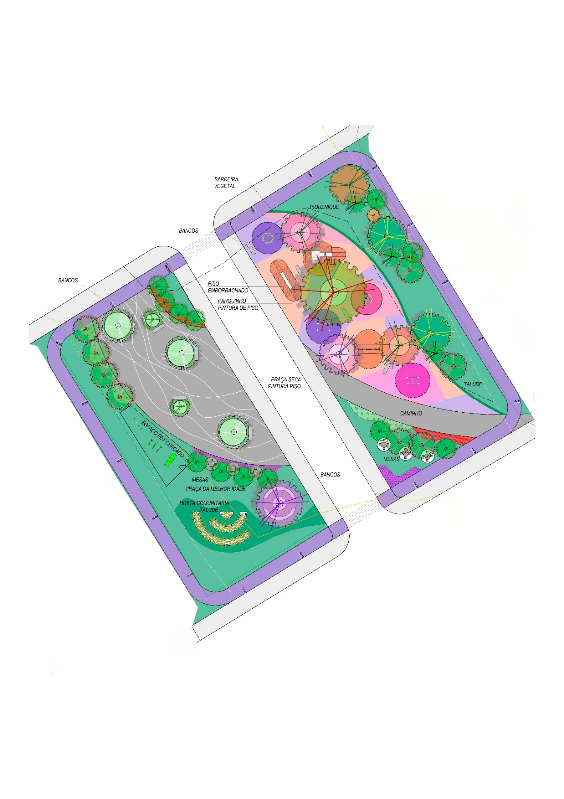 De acordo com o projeto, a Rua Azaléia separa a área da praça em dois grandes setores que foram utilizados para priorizar usos distintos. No entorno das duas áreas também está prevista a implantação de uma pista de caminhada de 200 metros para prática de atividades físicas ao ar livre.
