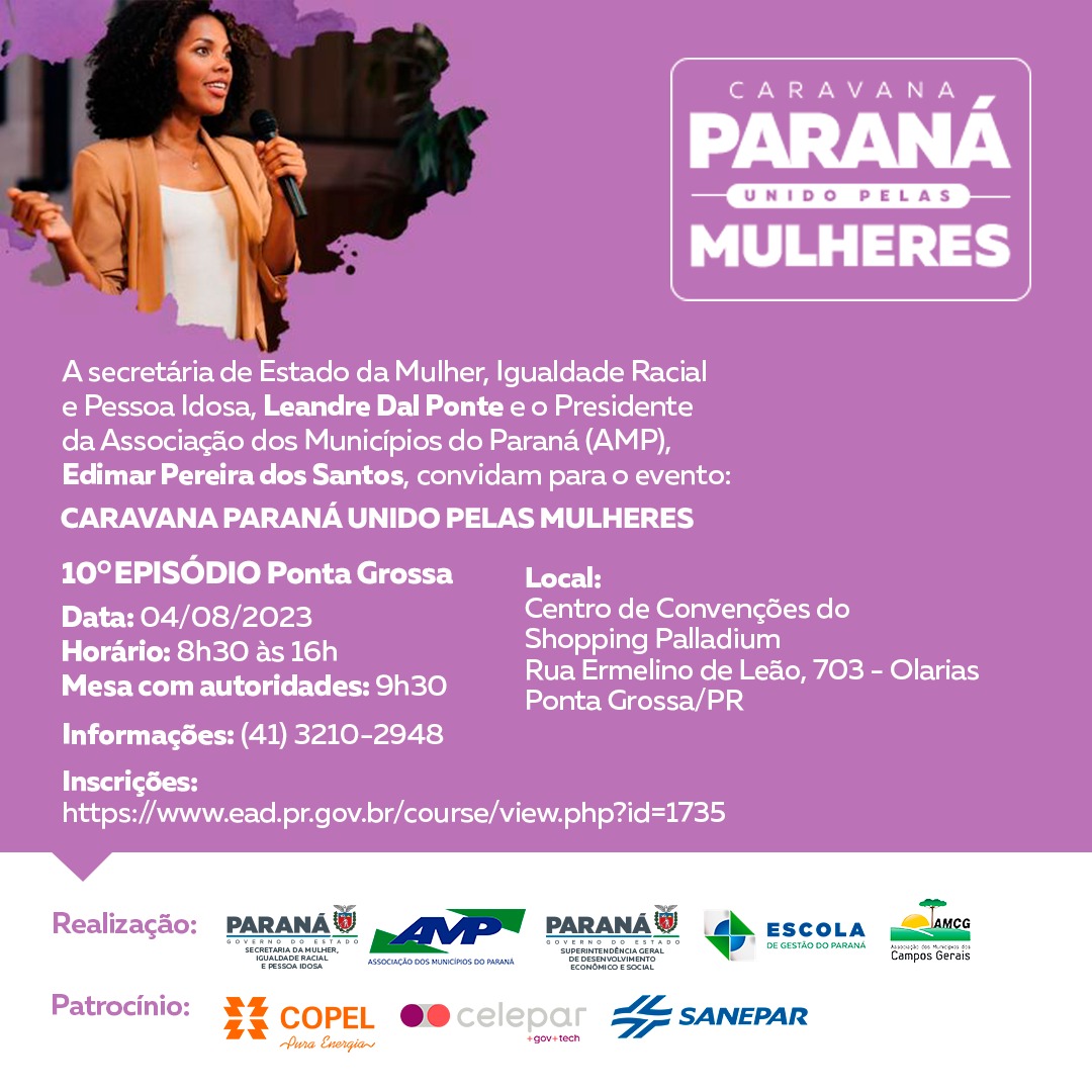 Promovida pelo Governo do Estado, por meio da Secretaria de Estado da Mulher e Igualdade Racial (SEMI), com o apoio da Associação dos Municípios do Paraná (AMP), a “A Caravana Paraná Unido pelas Mulheres” será realizada em Ponta Grossa na próxima sexta-feira (04).