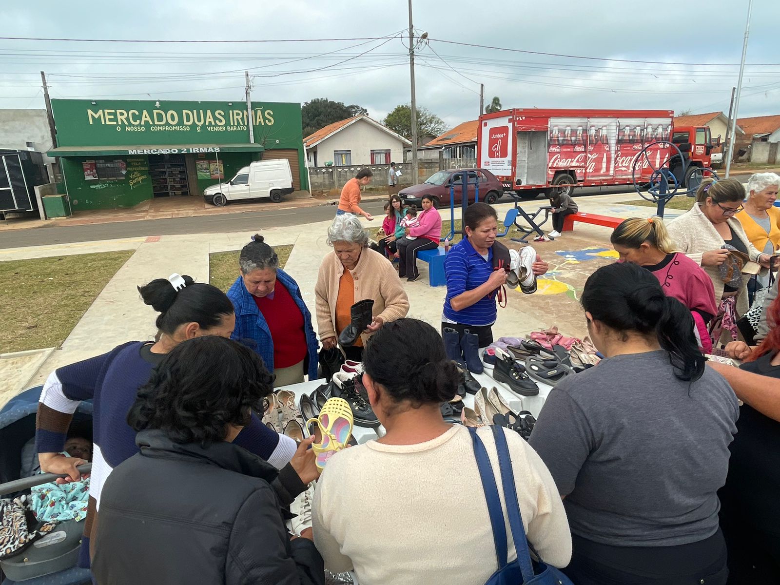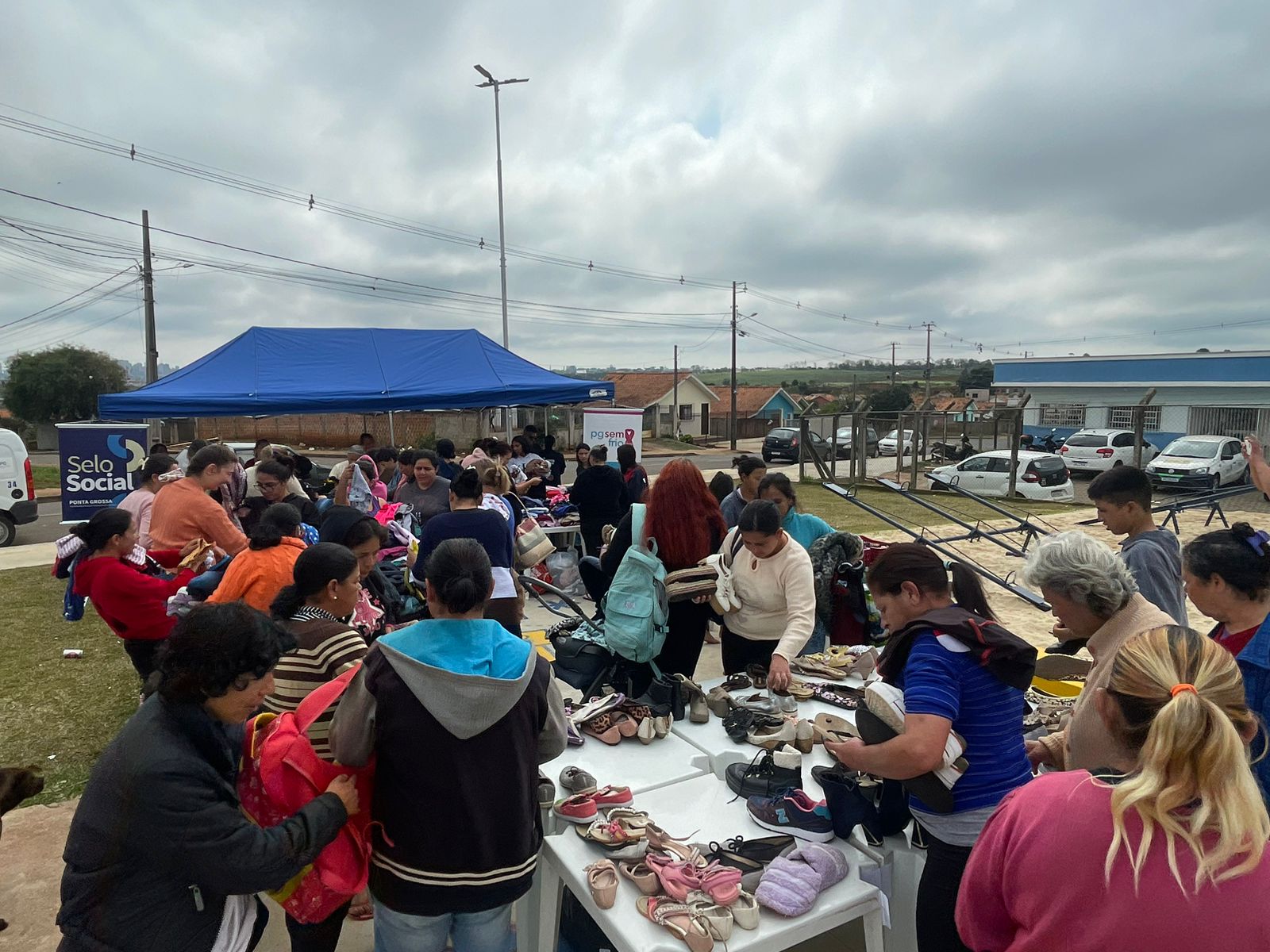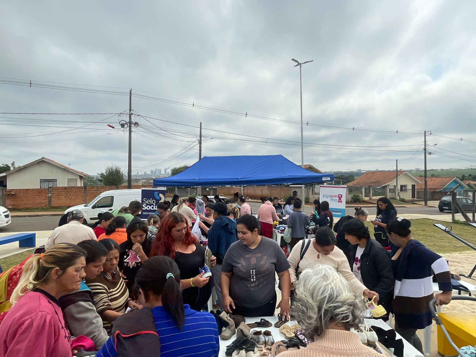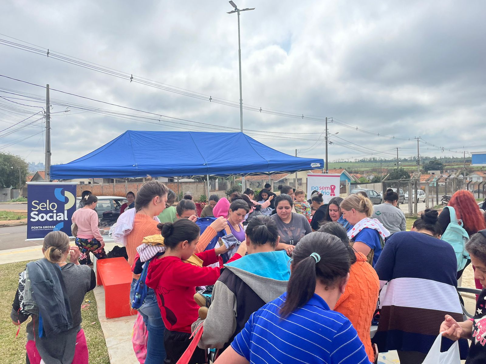 A ação de entrega das doações da Campanha PG Sem Frio, realizada nesta quarta-feira (16), lotou a praça do Recanto Verde. Toda a comunidade pode participar e levar para casa agasalhos, calçados, acessórios de inverno e cobertores.