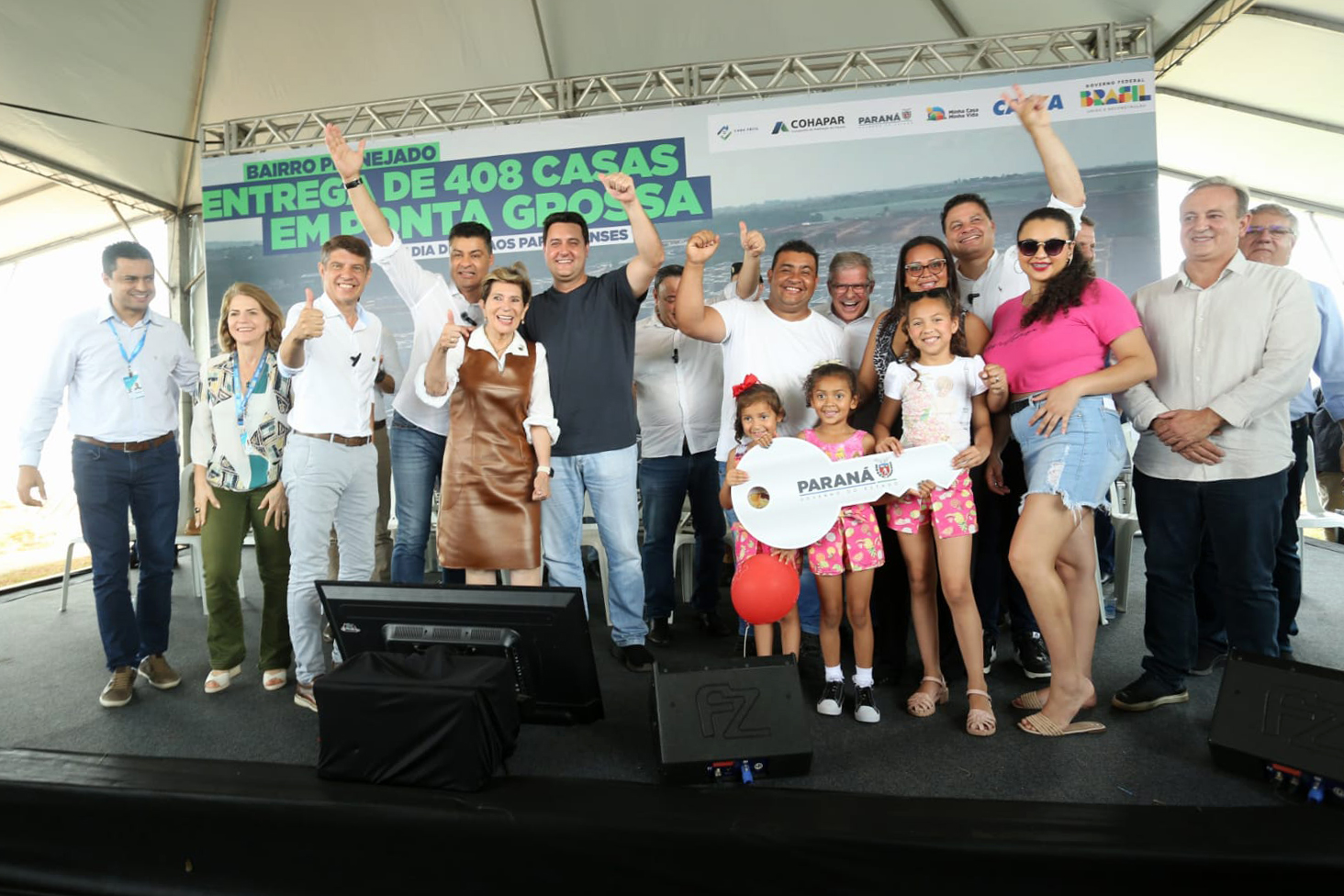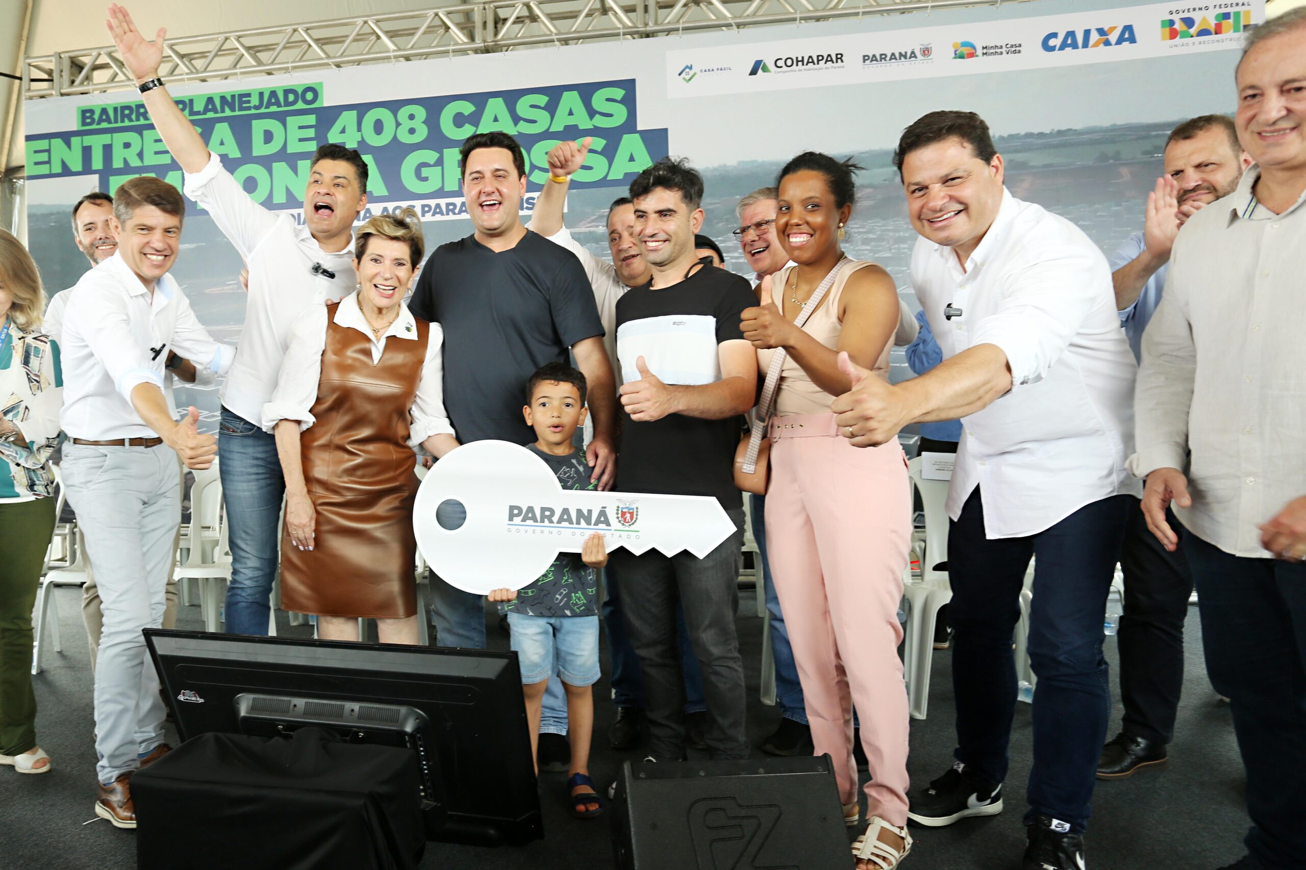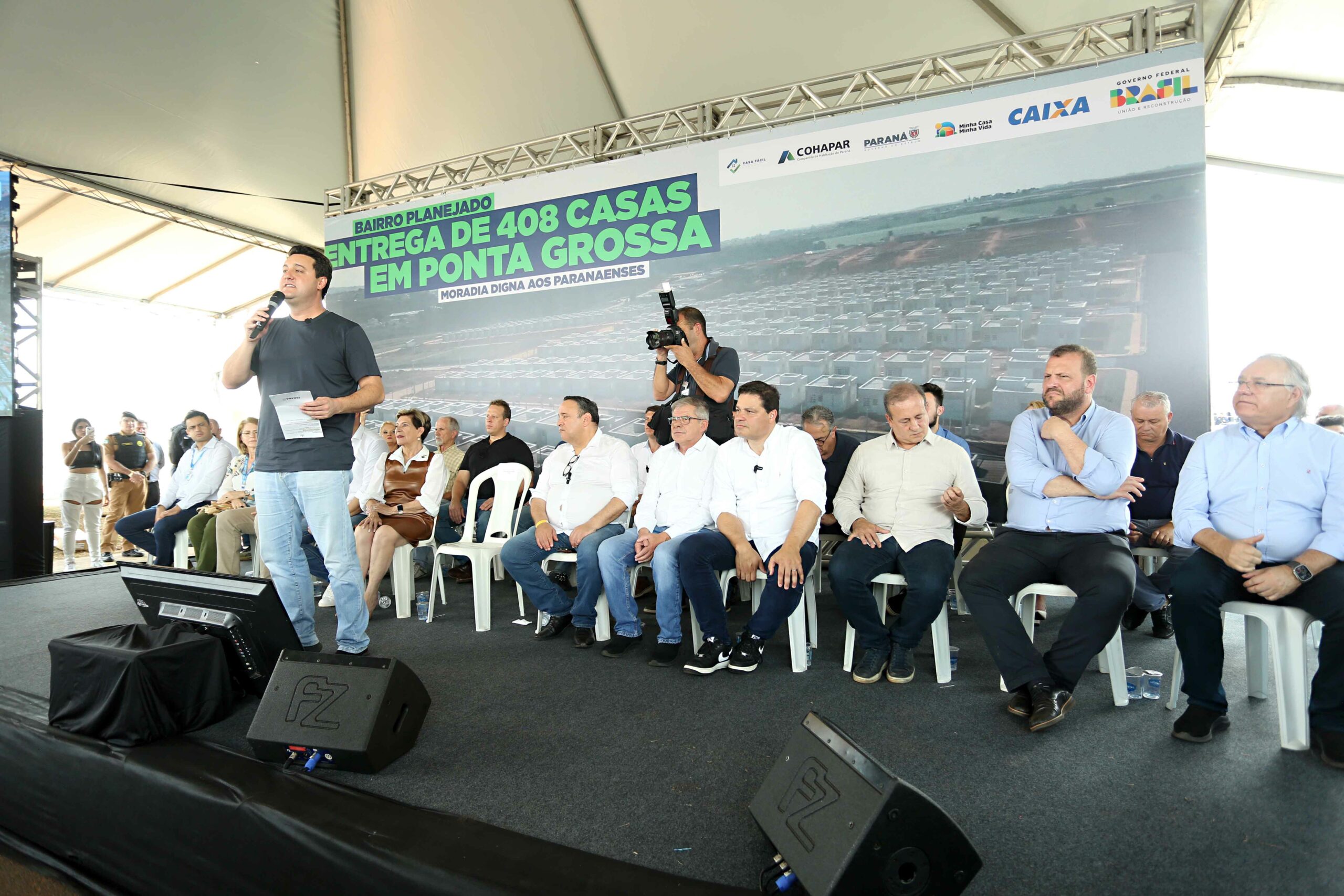 A Prefeita Elizabeth Schmidt e o governador Ratinho Jr realizaram a entrega de 408 casas do Residencial Bem Viver Uvaranas, em Ponta Grossa, neste sábado (07). O investimento é de mais de R$ 605 milhões e foi viabilizado através de parceria entre o governo do Paraná, Cohapar, Construtora Pacaembu, Caixa Econômica Federal e Prefeitura de Ponta Grossa.