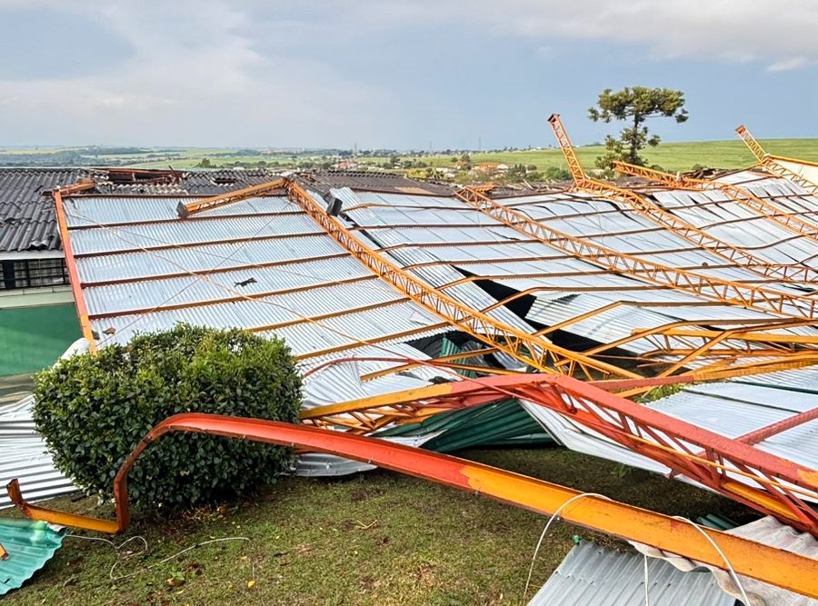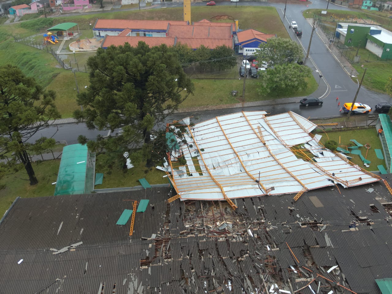 Entre os locais atingidos pelas fortes chuvas, está a Escola Municipal José Pinto Rosas, onde a cobertura de uma quadra de esportes desabou, causando danos no prédio. Diante disso, a Defesa Civil interditou o imóvel.