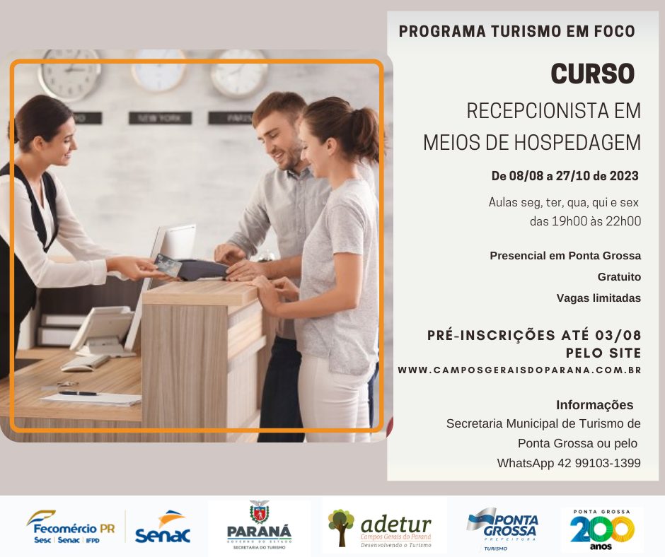 A Prefeitura de Ponta Grossa, através da Secretaria Municipal de Turismo, informa que a Agência de Desenvolvimento do Turismo (Adetur) Campos Gerais está com inscrições abertas para o Curso de Recepcionista em Meios De Hospedagem.
