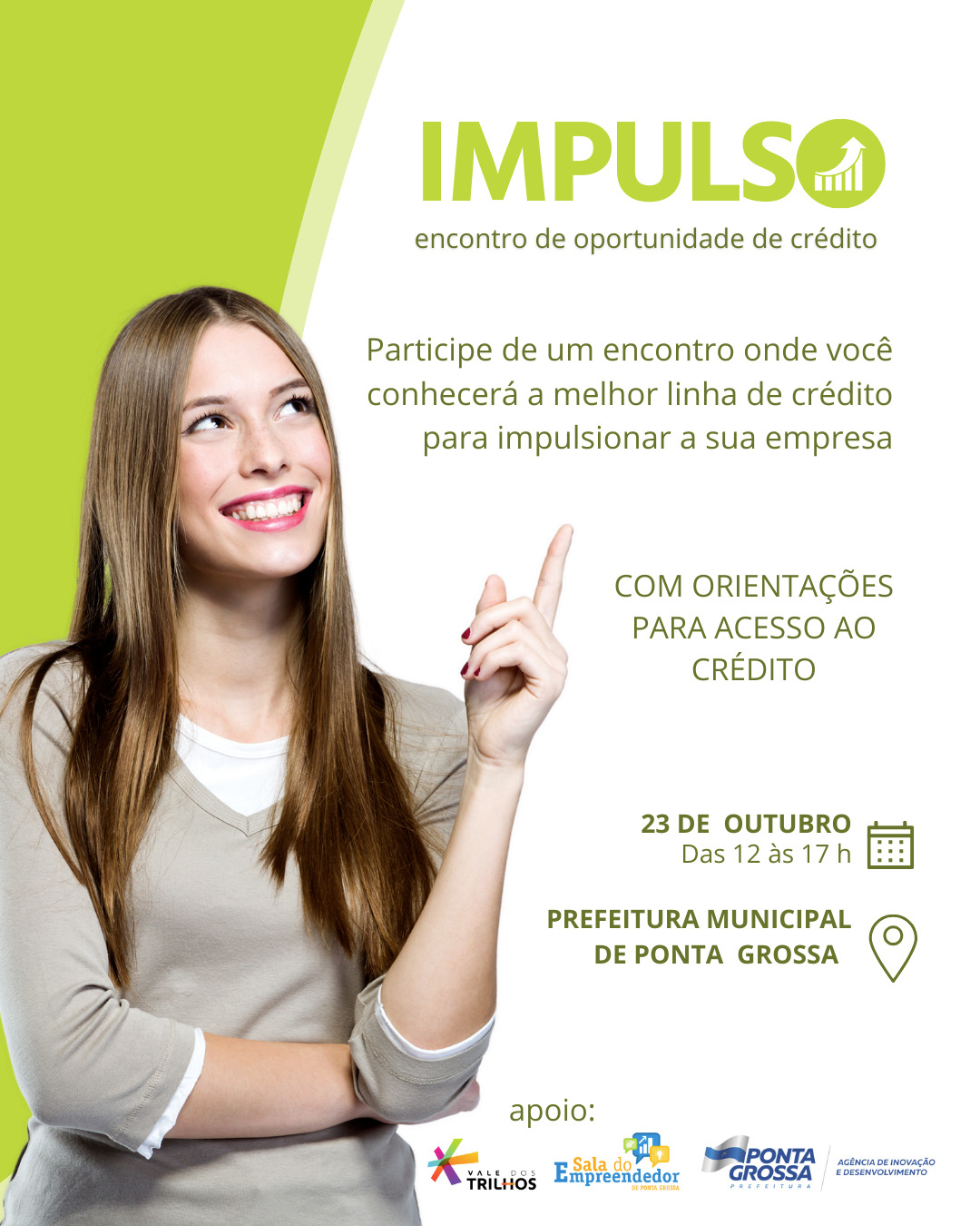 “O crédito desempenha um papel fundamental no crescimento e na sustentabilidade dos pequenos empreendedores. É importante desde a fase inicial, gestão de fluxo de caixa, competitividade e para superação de crises. Com o Programa Impulso, através das instituições financeiras parceiras do programa o empreendedor encontrará em um mesmo local as mais diversas linhas de crédito para atender a sua necessidade”, explica a presidente da Agência de Inovação e Desenvolvimento, Tônia Mansani.