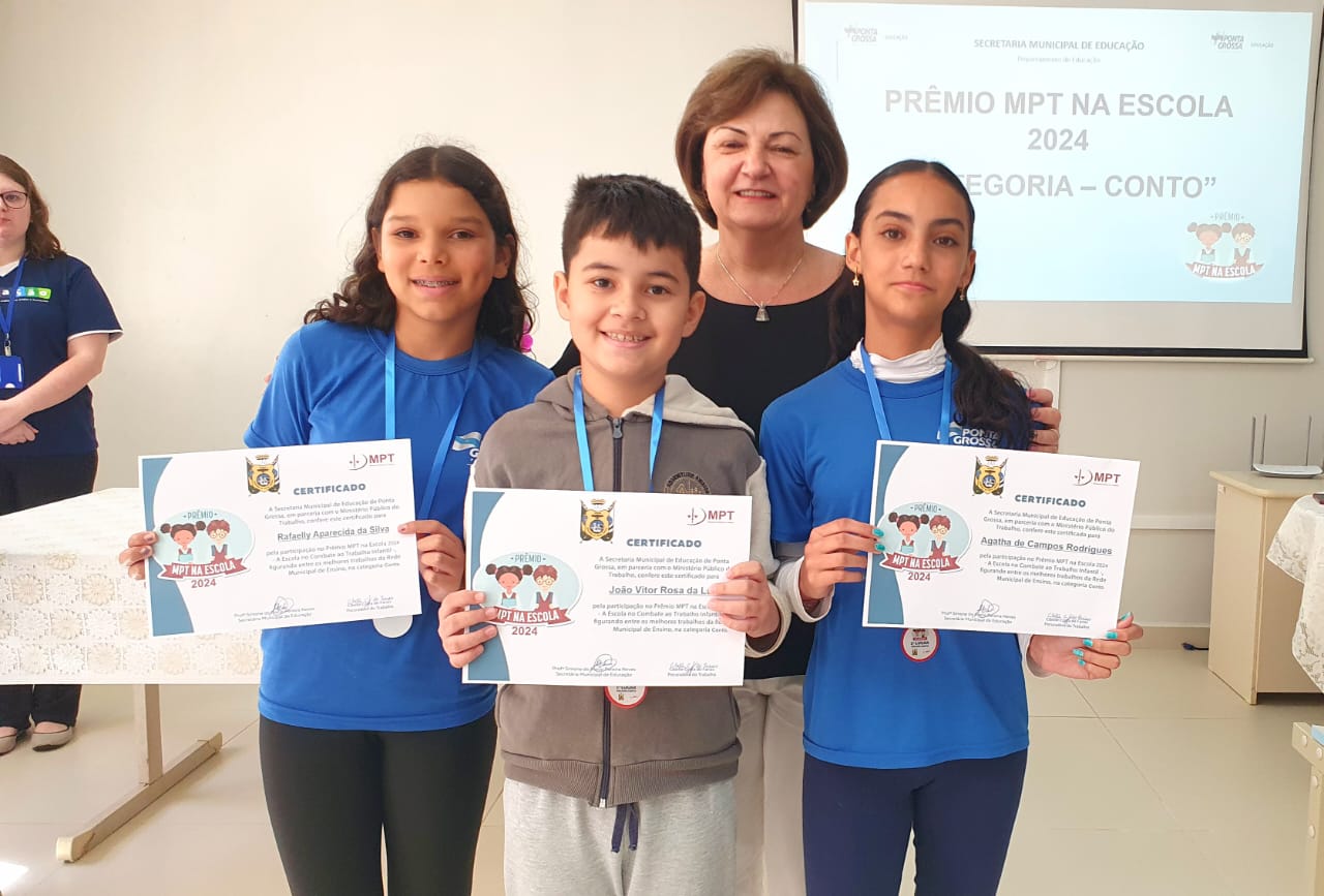 O Prêmio MPT na Escola, que leva às escolas atividades de prevenção e combate ao trabalho infantil, premiou nesta semana estudantes que participaram das ações do programa, realizado em parceria entre o Ministério Público do Trabalho e a Secretaria Municipal de Educação de Ponta Grossa. Alunos que realizaram trabalhos escolares de destaque receberam certificados e medalhas.
