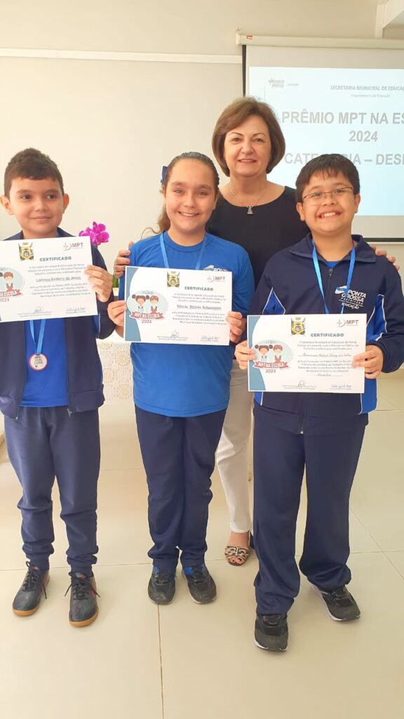 Foram premiados os melhores trabalhos literários artísticos e culturais nas categorias Conto, Poesia e Desenho, realizados a partir das orientações do “Projeto MPT na Escola 2024: A Escola no combate ao trabalho infantil”, disponibilizadas pelo Ministério Público do Trabalho e aplicadas pelas professoras da Rede Municipal de Ensino. As ações foram realizadas por turmas do 4o e do 5o ano, de março a junho, e contemplaram reflexões dos estudantes sobre a temática, que visa conscientizar e prevenir o trabalho infantil.