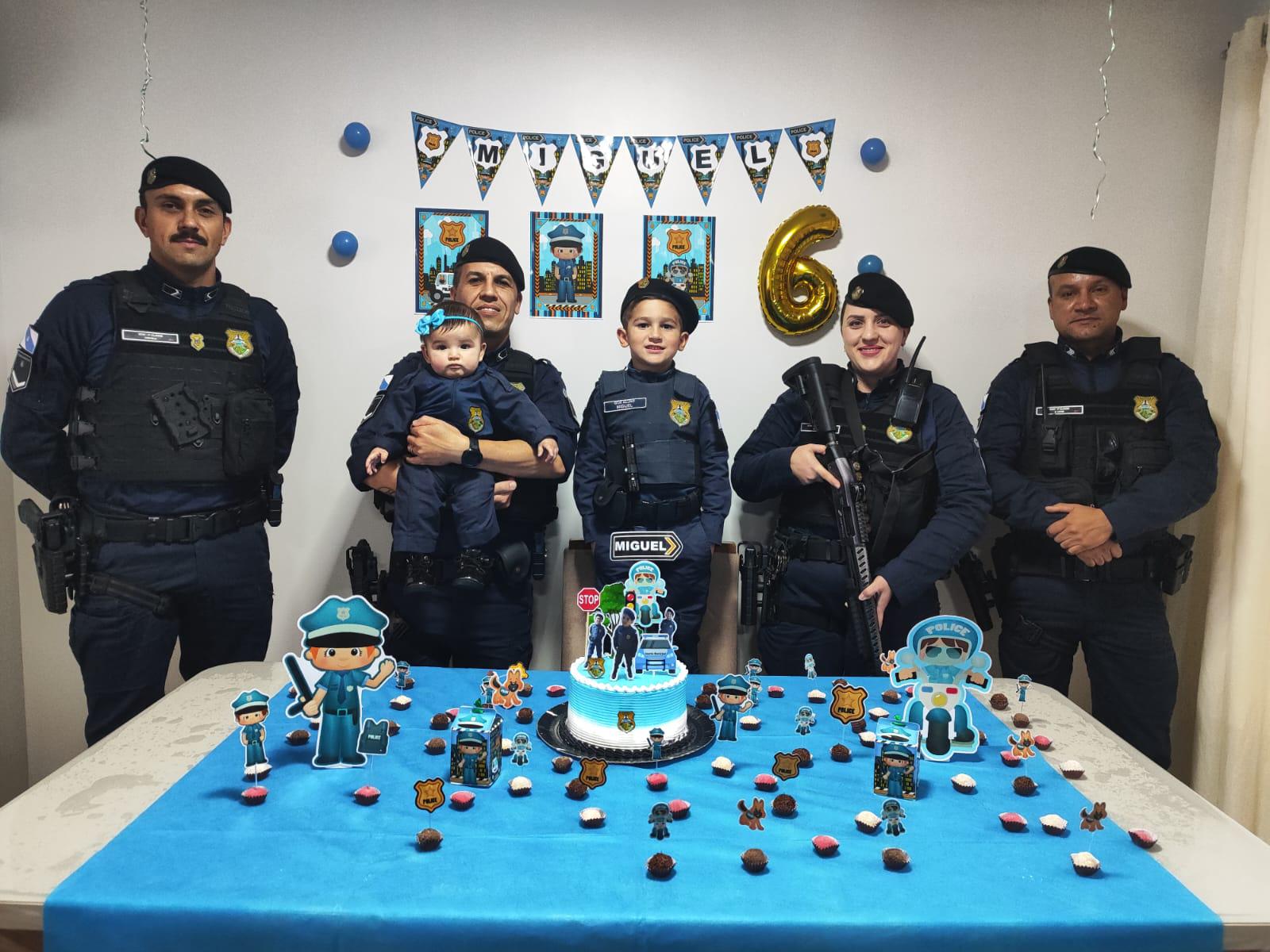 O pequeno Miguel Pinheiro Melnisk comemorou seu sexto aniversário de um jeito diferente neste fim de semana, em Ponta Grossa: com farda, sirenes e admiração pela Guarda Civil Municipal. A paixão pela corporação começou há algum tempo, quando o tio do garoto passou a integrar a GCM. Desde então, Miguel se encanta por tudo o que envolve a instituição – dos uniformes aos carrinhos e desenhos – e, por mais um ano, escolheu o mesmo tema para sua festa de aniversário.